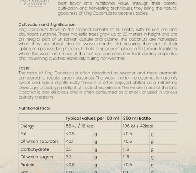 Our commitment to sustainable sourcing practices ensures that choosing King Coconut also means choosing an eco-friendly product. We work closely with local communities and farmers in Sri Lanka to ensure that our sourcing practices have a positive impact on the environment.