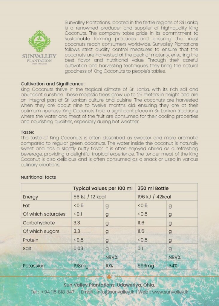 Sunvalley Plantations Sri Lanka exclusively sells us King Coconut, and Ishara is the exclusive partner in the region.